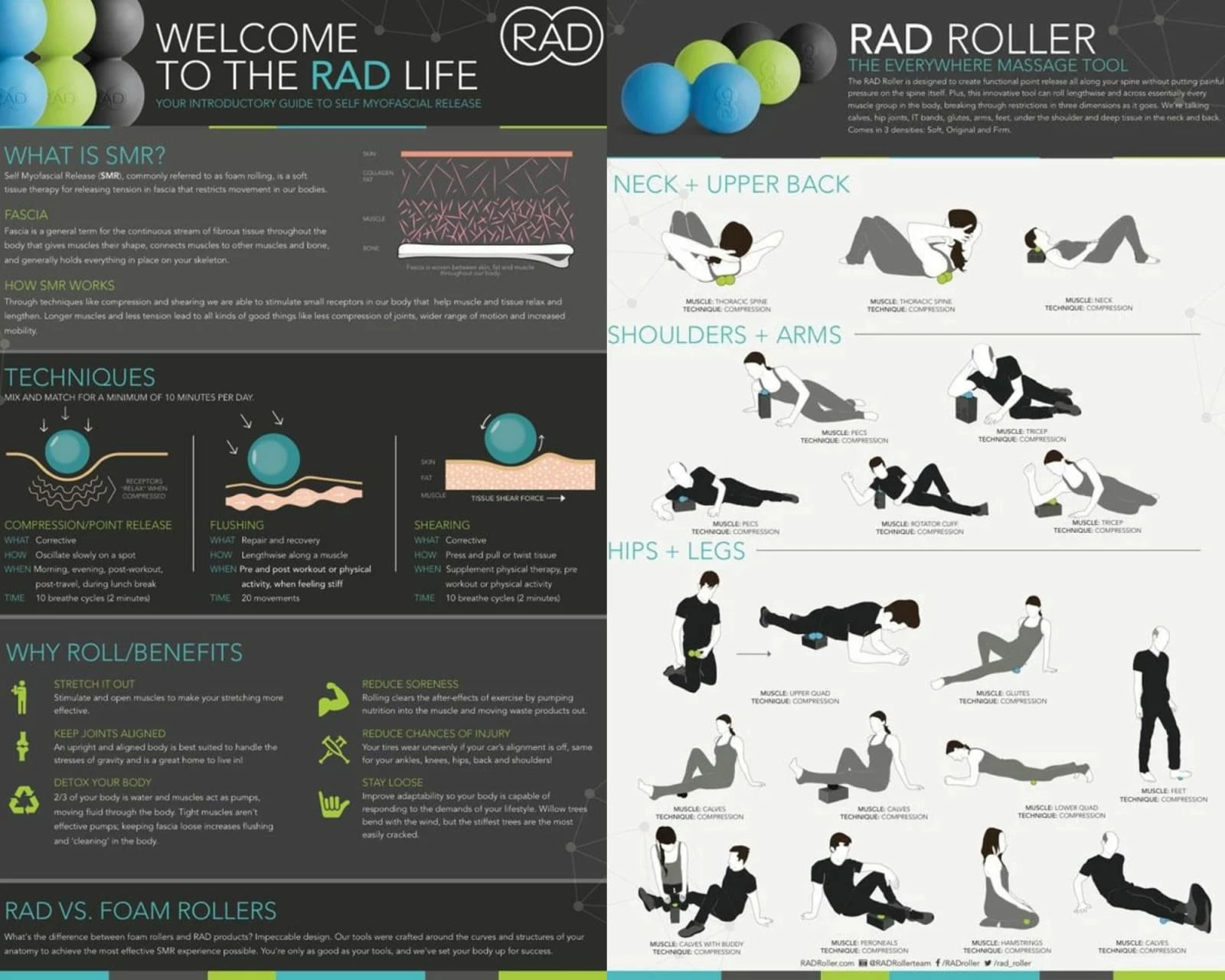 Based on the bio-mechanics of the spine, the RAD Roller massaging tool was carefully designed to safely and effectively improve posture and mobility, reduce soreness, and limit long term injury risks as you train. Use it to create movement and free restrictions in the spine, or use it to free up muscle tissue anywhere from the neck to the legs, through soft myofascial release (SMR). The RAD Roller can help empower people to work on their own bodies to create effective, long lasting change.